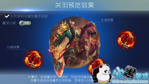 该魔灵在比赛中,总体积达到1万吨时,可以自动召唤出魔灵,持续到比赛结束,最大的一颗球为魔灵主体,其它分身小球为魔灵子体附身。主球效果为关羽骑马,手拿大刀;子体为一颗火球,上面带着一个“忠”字。