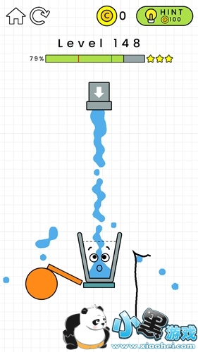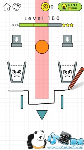 第148关:这一关有点难度,从杯子右侧黄色隔板的右端向左上方画线,最后做一个小弯曲来接住圆球。