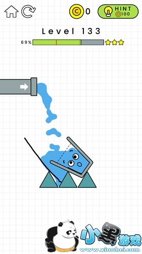 第132关:在黄色横条左侧画一个倒着的L来增加左侧重量,让杯子落下后可以保持少许的平衡时间,不需要太精准,只要保持别瞬间掉下去就可以,然后水自然装满杯子就行了。