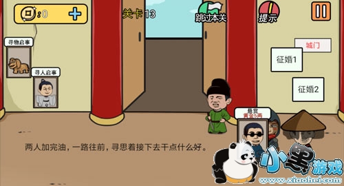 第十三关只要把左边“悬赏黄金5两“的相框拖到人物无名那里就可以顺利通关。