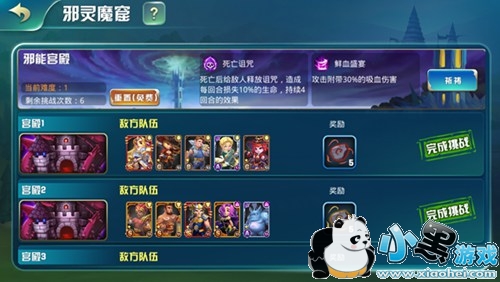 邪灵魔窟是装备注魔材料和专属装备的主要产地,共计6个小关卡+1个BOSS关卡,每关敌人都有非常强力的buff,而且由于魔窟的毒气英雄们不能战斗太久,每天每位英雄只能上阵一次,实在打不过还可以“祈祷”,通过减少,每激活一个祈祷通关奖励都会降低,殿下要仔细考虑寻找平衡点哦~