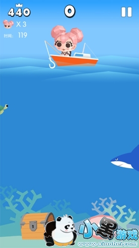 越好看的鱼分越高,大鲨鱼也是可以钓的,海底的宝箱和珍珠也是可以钓的哦。不过钓到海胆和河豚就要扣一条命,3条命扣光就失败了,所以要看准了再下手哦!