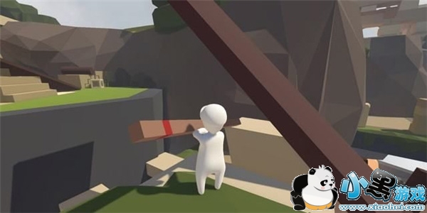 先将身边的木块放到跷跷板一侧,向被抬起的另一侧冲刺跳跃后抓住对面高台上的木板,可将木板拉下来。