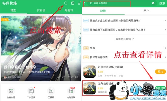 步骤二:打开好游快爆→右上角搜索“方舟生存进化”→进入方舟生存进化专区。
