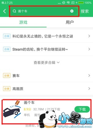 2.安装好后,打开好游快爆,点击右上角的搜索按钮,输入“画个车”,待游戏出现后点击旁边的【下载】按钮即可进行下载。