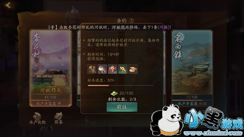 游戏中玩家集中在某处大量垂钓后,既有可能触发河妖作乱事件,玩家们点击钓鱼点选择界面的【河妖作乱】会跳出副本框,点击前往即可。