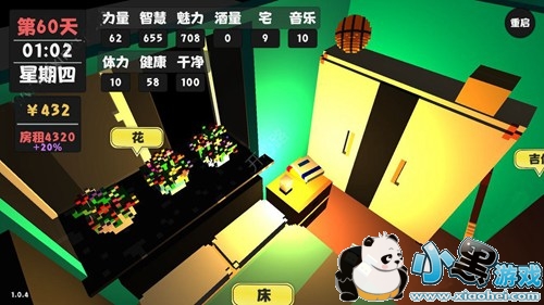 开局先去养花,一天到头全部养花。因为是第一天,所以养花时体力和干净是保持相同的,体力还有25的时候,去做饭,这样干净就变成0,体力变成90,然后去洗澡,接着养花。这里注意一下,等到0点的时候,去照镜子,选择无视,拿一百块。(只能拿一次)
