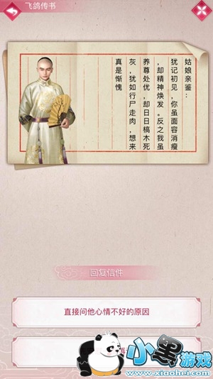 “云中谁寄锦书来,雁字回时,月满西楼。”在只有车马交通的年代,古人常用飞鸽传书,写信以解相思之情。《紫禁繁花》手游中,玩家在与王爷书信往来时,也可选择不同的回复,有的会增加人物羁绊值,有的会给予阅历奖励,王爷们也会做出不同回答,需要谨慎选择哦。