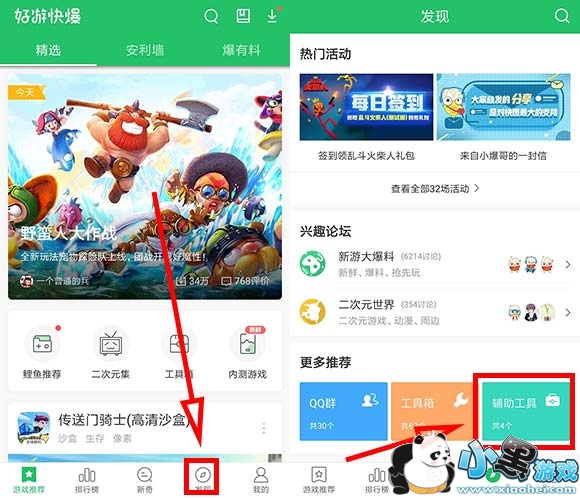 第二步:打开好游快爆app,点击下方的【发现】,在发现里面点击【辅助工具】;