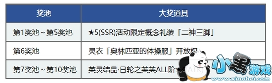 【大奖道具】第1~5次奖池:活动限定概念礼装★5(SSR)「二神三脚」 第6次奖池:灵衣「奥林匹亚的体操服」开放权 第7~10次奖池:英灵结晶·日轮之芙芙ALL阶★4(ATK)