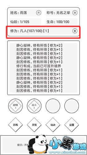 游戏中当修为超过界限值之后,就可以点击后面的“晋”按钮进行进阶。