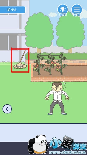 第6关:点击右下角按钮,前往右侧区域,点击墙边的草帽和木杆,获得它们。