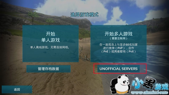 登陆方舟,开始游戏,选择多人游戏下方的UNOFFICIAL SERVERS,私人服务器选项,进入后,即可看到全部的服务器。