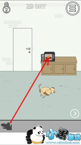 回到左侧区域,点击微波炉打开,按住道具栏中的手套,拖到微波炉中,拿出鸡肉。