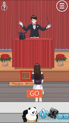 然后点击魔术手后面的帷幕,拉开后可以看到墙壁上有一个锁住的柜子,按住钥匙拖到柜子上,打开柜子。