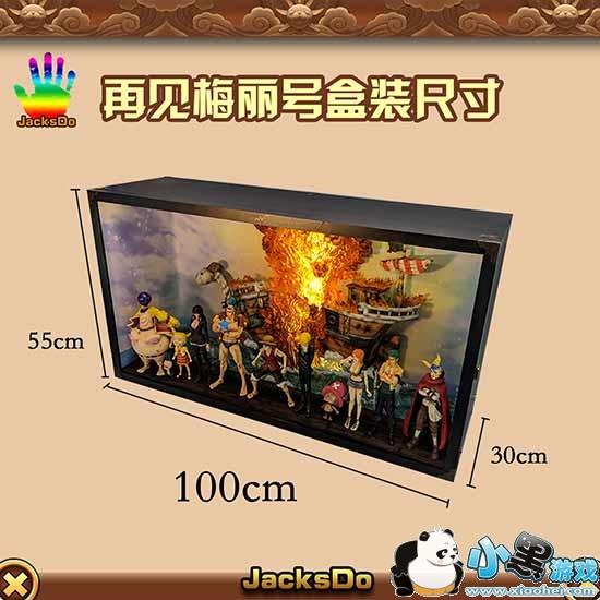 这款作品采用了JacksDo上一次在“卡二VS蛇人路飞”时使用的盒装场景技术,整体共有11个人物加上背景中高浮雕的着火梅丽号组成,长度达到了惊人的100厘米。