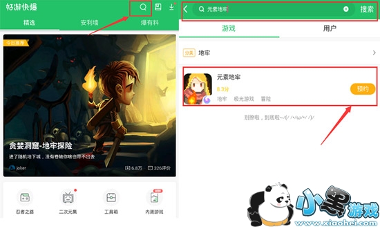 2.安装好后,打开好游快爆,点击右上角的搜索按钮,输入“元素地牢”,待游戏出现后点击旁边的【预约】按钮即可进行预约。