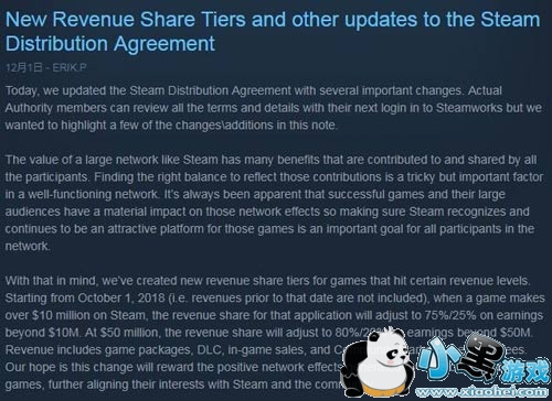 根据信息,从2019年10月1日起,当游戏在Steam上的销售额突破1000万美元时,超过1000万美元的部分会按照75%/25%的比例进行分成;如果游戏的销售额突破了5000万美元,超过5000万美元的部分会按照80%/20%的比例进行分成。