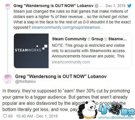 《神奇之歌(Wandersong)》的开发者Greg Lobanov在推特呼吁玩家们停止在Steam上购买独立游戏:“Steam只是改变了游戏规则,让那些赚取数百万美元的人赚的更多,富有的人变得更富有,而那些在底层的人却得到的更少,付出的更多。他们这样做只是为了安抚最大的利益集团,但这并不利于游戏社区和市场的健康,一些像《神奇之歌(Wandersong)》这样的实验性独立游戏会受到很大的影响。”