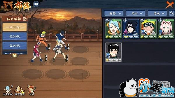 由于游戏的战斗以小队的形式展开,所以布阵是十分重要的环节。在布阵过程中,你能搭配除自己扮演的角色以外的其他忍者的阵容、站位。为了和其他忍者密切配合,你需要灵活调整自己扮演的角色的天赋。