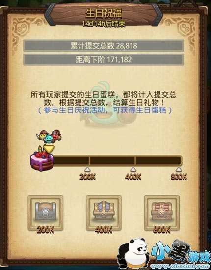 全服累计提交生日蛋糕达到200,000后,所有玩家可获得奖励:钻石*3、恶作剧碎片*5、金币*100K。