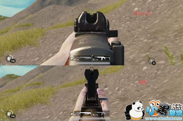 上图是QBU射手步枪和Mini14射手步枪在裸枪情况下的机瞄对比。我们可以看出,虽然QBU射手步枪的机瞄视野“颜值”不高,但是十分实用,准星突出,视野开阔,对于红点镜不是特别依赖。这一点对于落地初期的刚枪十分有利。