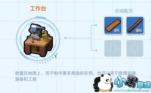 在背包中合成工作台,把工作台放在地面上,即可通过使用工作台制作更多高级物品,也可以用于修理武器、装备和工具。