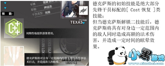 作为从战斗一开始就要放入战场的先锋干员,德克萨斯具有一般先锋干员不具有的解场功能。所以在大多数前期下场的先锋干员都需要为了后续的其他干员角色腾出位置的时候,德克萨斯依然有充分的理由留在场上。
