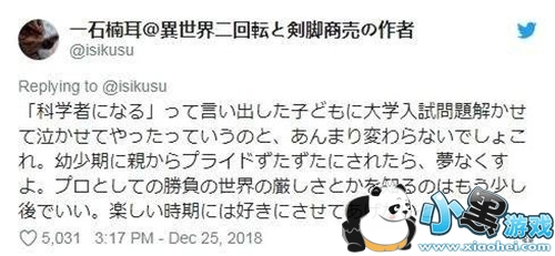 isikusu还表示,这种事很可能会给孩子带来心理创伤,产生一种「只要有一个梦想,父母就会来粉碎它」的潜意识,而孩子长大后很可能会成为那种没有动力追求梦想,很容易放弃任何事的人。他还用一种比喻来形容这件事:「就好像孩子说'我想成为一名科学家',然后你突然就去让他参加高考,他答不上来题而哭泣一样。」