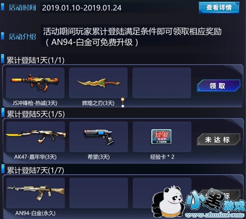 活动内容:活动期间玩家累计登陆游戏可获得对应奖励。更有可免费升级的【AN94-白金】等着你!!!