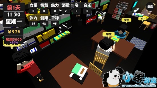 和游戏名一样,游戏中的人物属性非常重要,比如喝酒可以提高酒量,之后可以和房东喝酒扯皮,减少房租上涨的金额,这真的很社会了!另外,你可以去商场买东西或兼职挣钱,也可以去网吧上网与当网管挣钱,每一个场所都有规定的功能,可谓是非常贴近生活了。甚至你还能进行直播,成为斗鱼一哥!算是一款非常接地气的游戏了。