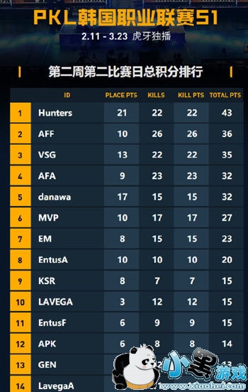 第二周第二个比赛日A&B组的四场对决已经结束, Hunters战队以46积分登顶第一,AFF战队和VSG战队分别排列第二三名,AFA和danawa等战队仍有赶超的可能。