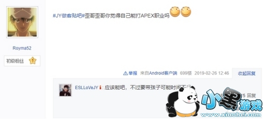 2月26日知名LOL解说、国服狼王JY做客百度贴吧Apex英雄吧,和Apex英雄吧吧友开启聊天模式。两天前JY哥才打完虎牙Apex英雄之王24H巅峰邀请赛又马不停蹄来贴吧和粉丝互动,身为电竞圈大神偶像还这么接地气,这也太赞了吧。