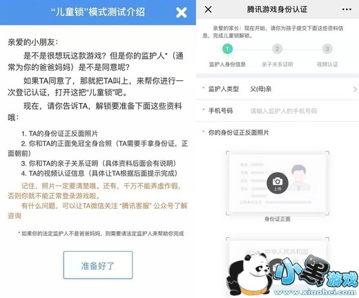 葡萄君在今天再次尝试用昨天新注册的QQ号登录《王者荣耀》,果然弹出了和公告中一模一样的“儿童锁”解锁验证页面,点击下方左图中“准备好了”按钮即可进入解锁流程,解锁的第一步需要监护人填写手机号码,上传身份证正反面照片。