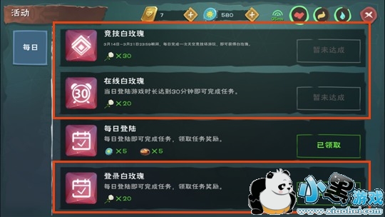 1、完成以下条件,分别都可以在活动面板领取白玫瑰