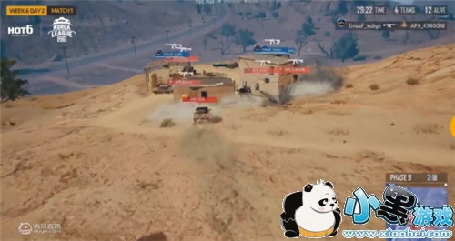 第一局:决赛圈来到沙漠图野点的一处小房区,APK、EntusF战队占据房区优势明显。无路可退之时,位于圈边高点的VSG留下一人架点,其余队员利用烟雾弹封锁敌人视线,而后开车向房区发起死亡冲锋。最终他们凭借完美的团队配合逐一清扫房区成功14杀吃鸡!
