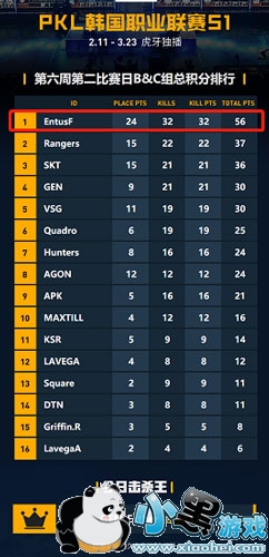 四场比赛结束,EntusF发力超猛,击杀排名双第一极大优势锁定今日比赛积分第一。