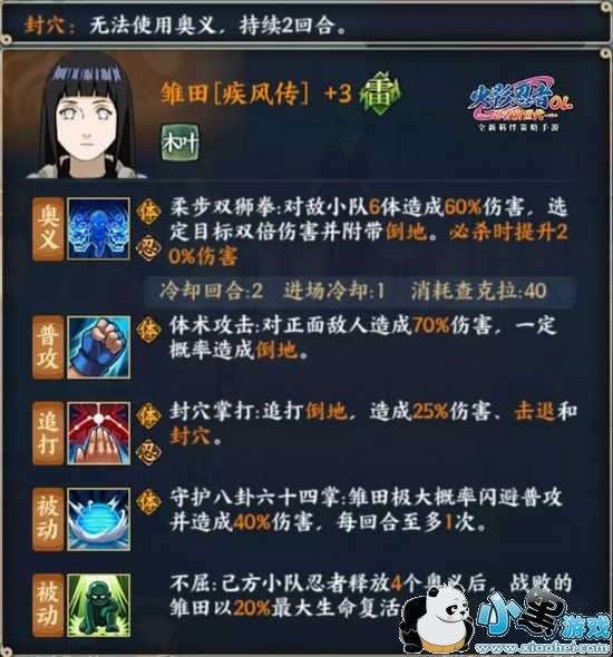雏田【疾风传】可使用奥义柔步双狮拳对敌人发起猛烈的攻击,追打封穴掌当还能造成稳定的封穴状态!