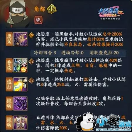 角都拥有3种属性的普通攻击,同时还可以使用漆黑触手攻击敌人或缝合友军伤口,进攻防御两开花!