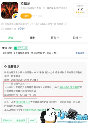 步骤三:在专详情页中,点击“《拉结尔》官方网站“报名,即可报名参加活动,获取测试资格。