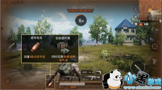 同时,游戏还有信号值显示。信号值可以使用“信号电池”、“全能医疗箱”两种道具回复。“信号电池”能一次性回复50点信号值,“全能医疗箱”能一次性同时回满健康值和信号值,选手可在地图场景内拾取或在空投箱中获得这两种物品。