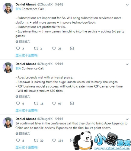EA在会议上称《Apex英雄》受到了玩家的好评,F2P的商业模式获得空前成功,未来会投入更多的精力在付费模式上的探索,作为游戏开发商重生工作室也在巨大的开发挑战中吸取经验和教训,未来将为玩家带来更好的内容。同时EA表示《Apex英雄》将在未来1个财年为公司带来3~4亿美元(约合20~27亿人民币)。