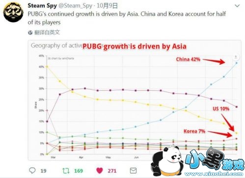 Steam平台公布了最近一周(10月2号到10月8号)销售排名,《绝地求生:大逃杀》成功三十连冠。根据Steam数据统计网站Steam Spy的推特账号给出的数据表明,《绝地求生大逃杀》的助推势力,主要来自中国——中国玩家已经占据了42%。