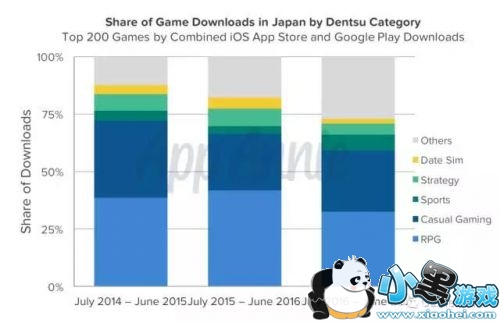 通过过去三年对日本下载榜以及收入榜Top 200的游戏进行追踪,该报告把游戏分成了11个品类,RPG游戏则又分成了6个细分品类。其中,休闲游戏和RPG游戏是日本市场下载量最多的游戏类型,两个品类占统计游戏总数量的一半以上。然而,在过去的一年里,其他类型的游戏业多的了相当一部分市场份额。