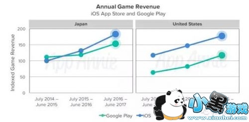 日本(蓝色)和美国(青色)手游市场年收入增长指数对比
