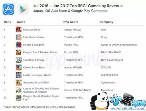 RPG收入榜Top 10:《怪物弹珠》、《F/GO》、《智龙迷城》、《龙珠Z激斗》、《宏蓝幻想》、《白猫计划》、《星之勇者斗恶龙》、《战国炎舞》、《剑与魔法》和《勇者斗恶龙:怪物仙境》。