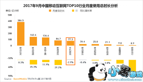 2017年9月,手游移动互联网TOP10行业月度使用市场排第5,总时长为77.3亿小时。在这份榜单中,手游和音乐是唯二出现下滑的,用户花在手游上的总时长减少了2.9%。