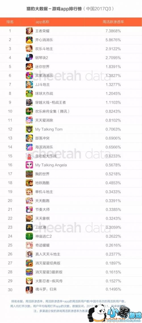猎豹的报告则提供了游戏APP TOP30的排行,排行以周活跃渗透率为标准,周活跃渗透率的计算方法为周活跃用户数除以中国市场总周活跃用户。由于包含其他所有应用的数据,因此周活跃渗透率能上1%的产品,已经可以挤进游戏榜前十。