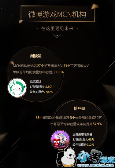 微博游戏MCN计划虽然实施时间不长,却已经取得突出的阶段性成绩。截止到今年8月,游戏领域的月度阅读较去年底提升了100亿;新增千名优质游戏博主,其中新增头部用户有16%来自MCN机构。2017年,微博游戏MCN机构达21家,涵盖游戏领域头部作者300余位,包括LOL无双小智、夏一可死毒舌等知名大V;单个账号阅读量平均提升111%;单个帐号粉丝量平均提升54.9%;账号视频播放总量增长50倍。