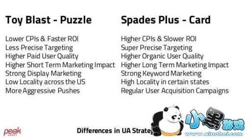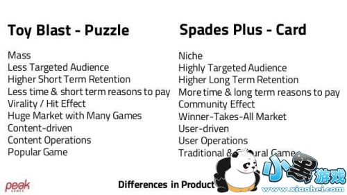 以伊斯坦布尔的视频游戏公司 Peak Games 的两款手游为例,益智游戏《Toy Blast》,和他们的卡牌游戏《Spades Plus》(《黑桃加》)。不同类型的差异必然导致产品定位、广告方式和最终保留率的差异。